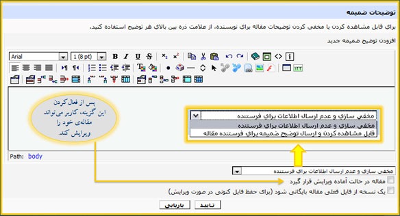 همچنین میتوانید از امکانات ارسال پست الکترونیک و ارسال پیغام به کاربرانمدیریت برقراری ارتباط) نیز برای خبررسانی به نگارندگان بهره ببرید.
